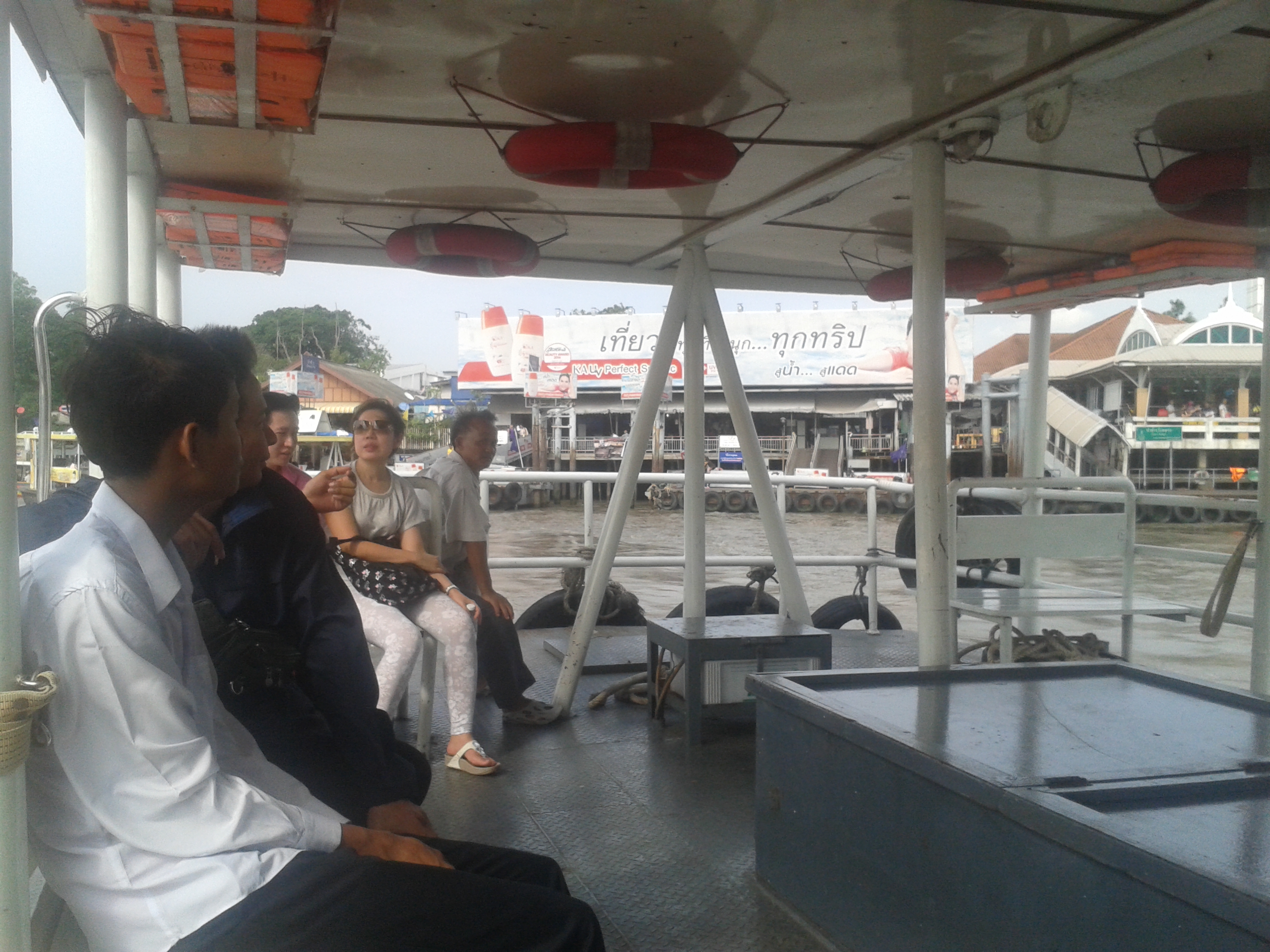 Po zaopatrzeniu się w pałeczki krabowe w panierce (swoją drogą nieznacznie gorsze od tych z marketu na Koh Phangan) oraz świeży sok z guawy (wielkie odkrycie poprzedniej wyprawy w te okolice), niesione przez tłum Azjatów wtoczyłyśmy się do wnętrza budynku przypominającego nadrzeczny dworzec. Na miejscu miałyśmy do wyboru trzy opcje- iść w prawo, w lewo lub na wprost. Jak na blondynki (choć niekoniecznie ze względu na kolor włosów) przystało, poszłyśmy na wprost i stanęłyśmy pod budką z samymi tajskimi napisami i liczbą 3. Stwierdzając (i słusznie), że jest to cena jednego przejazdu, dałyśmy uśmiechniętej pani strażniczce odliczoną kwotę i przekroczyłyśmy bramki. Idąc za tłumem wyglądających na zorientowanych tubylców, wsiadłyśmy na platformę, która regularnie przybijała do brzegu. Jak się okazało (i co w sumie można było wnioskować po cenie biletu), kursowała ona tylko na drugą stronę rzeki. Niezrażone częściowym niepowodzeniem w szukaniu drogi do Chinatown, rozkoszowałyśmy się dwoma minutami drogi i porządnym huśtaniem platformy.