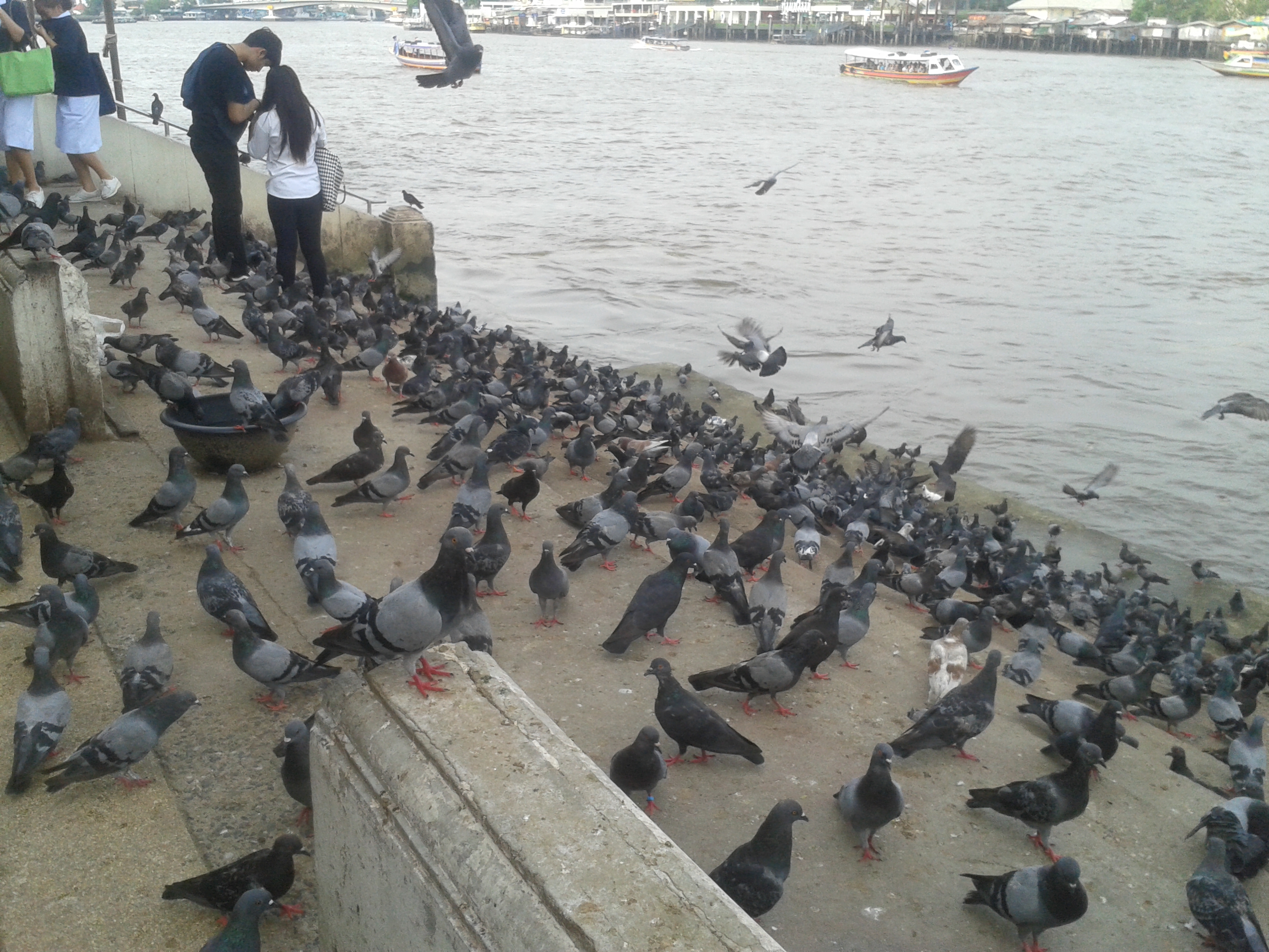 Po krótkim spacerze dokoła świątyni stwierdziłyśmy, że chyba czas wracać, tym bardziej że naszym obecnym celem było dopłynięcie boat taxi aż do Chinatown. Po około 5 minutach czekania w towarzystwie gołębi, udało nam się załapać na kurs powrotny, również za 3 THB.